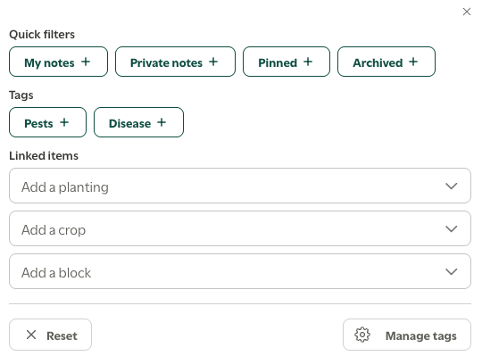 - Tags: Display all notes marked with one or more of your custom tags, like Pests or Diseases.