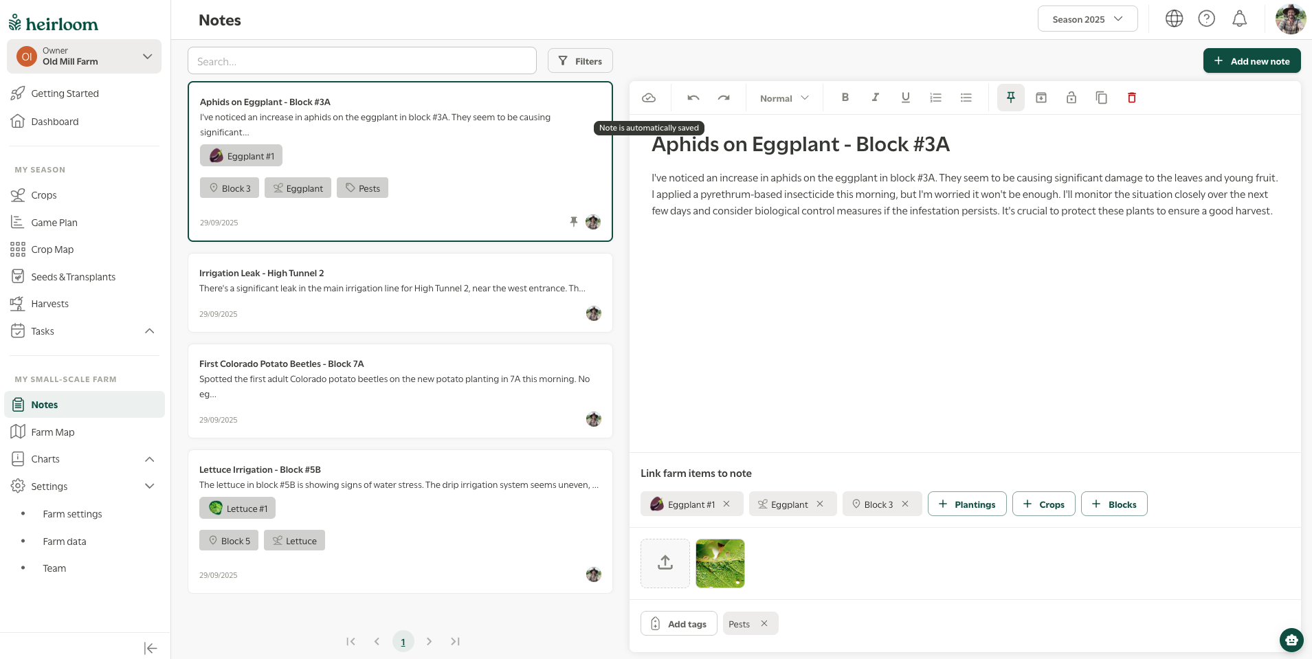 Unlike standard note-taking applications, this module allows every entry to be contextually linked to specific operational data points within Heirloom, such as a planting from your Game Plan , a crop from your catalog, or a physical block from your Farm Map. This creates a searchable, historical record tied directly to your activities, which is essential for analyzing trends and improving future decision-making. The following tutorials provide detailed procedures for utilizing this module’s full capabilities.